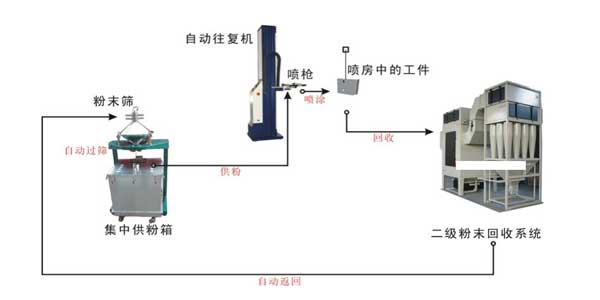 靜電發(fā)生器,噴粉槍、噴粉室、流化供粉裝置、粉末回收裝置和烘爐。通過與噴槍自動(dòng)升降機(jī)、懸掛輸送機(jī)、自動(dòng)送粉篩粉機(jī)等設(shè)備的結(jié)合使用可構(gòu)成自動(dòng)化流水線。
